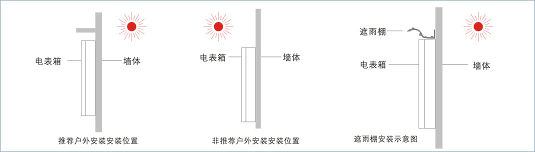 ●為延長電表箱內(nèi)電表和開產(chǎn)的使用壽命,電表箱安裝時應(yīng)盡量選擇陰涼干澡的場所,避免陽光長時間直接照射,適合戶內(nèi)安裝。戶外安裝表箱上方應(yīng)有遮擋物,防止暴雨時高墻積雨水浸泡沖刷。